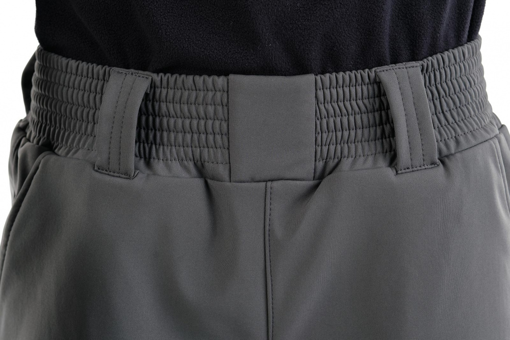 Брюки по низу регулируются утяжками. Пояс брюк на широкой простроченной резинке, дополнен шлевками. Два кармана у пояса без застежки.