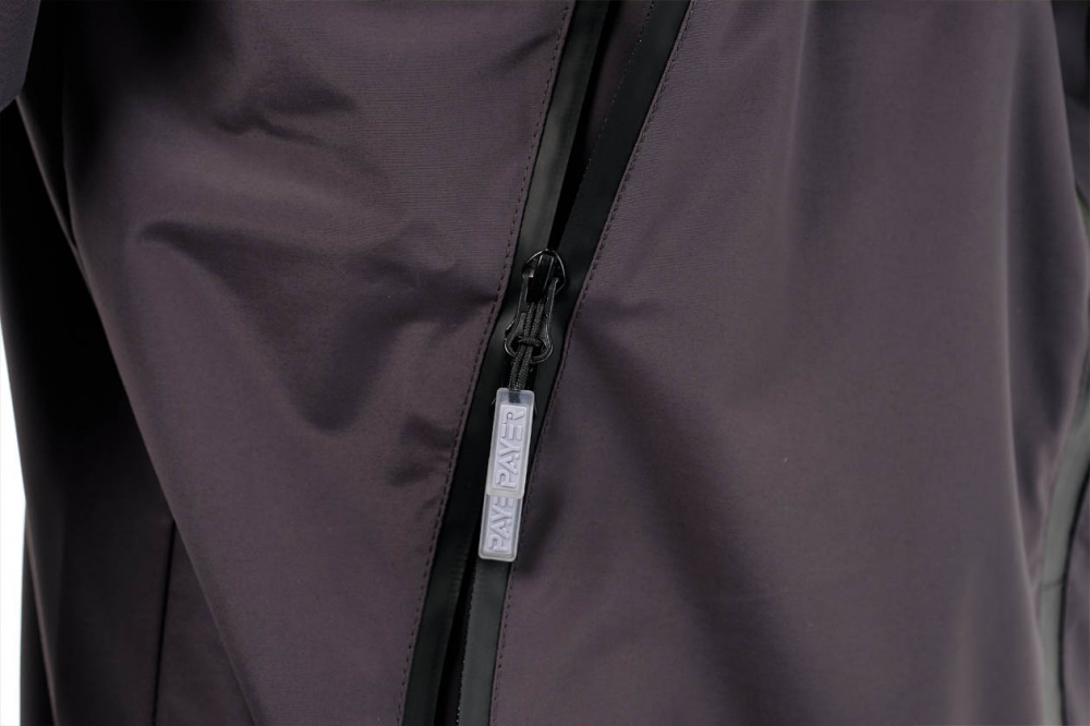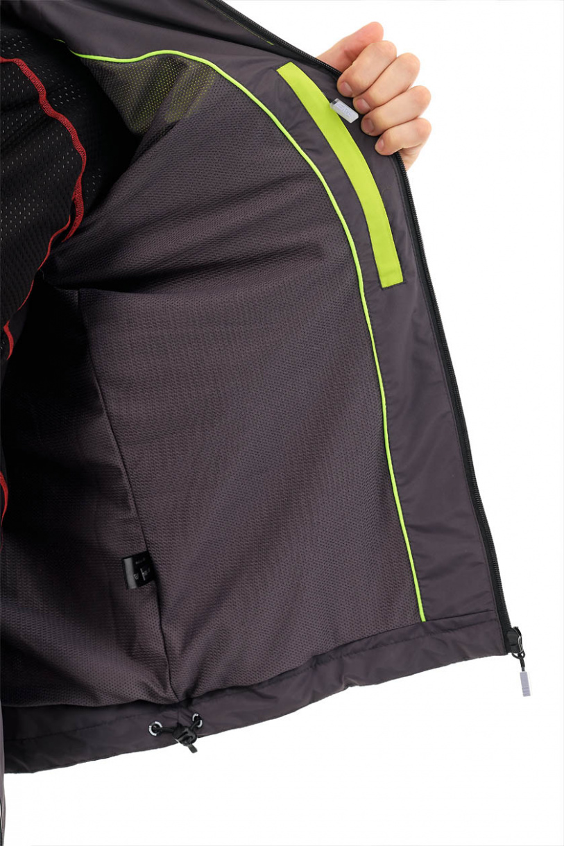 Куртка прямого кроя удлинена по спинке, по низу утягивается круглой резинкой. Застежка на центральную молнию с двумя бегунками дополнена внутренней планкой от закусывания. На полочках расположены два оригинальных прорезных кармана: каждый карман застегивается на молнию с двумя бегунками и делится на верхнюю и нижнюю части при помощи отделочной строчки. Все наружные молнии куртки - влагозащищенные.
