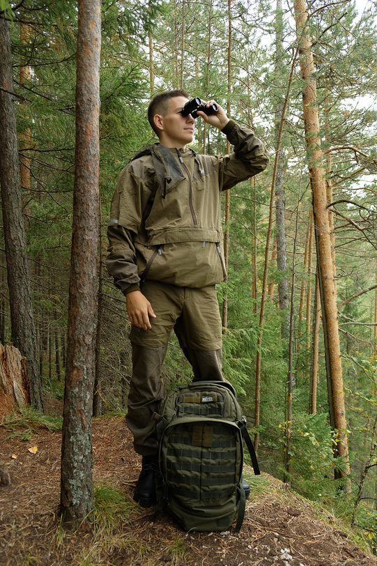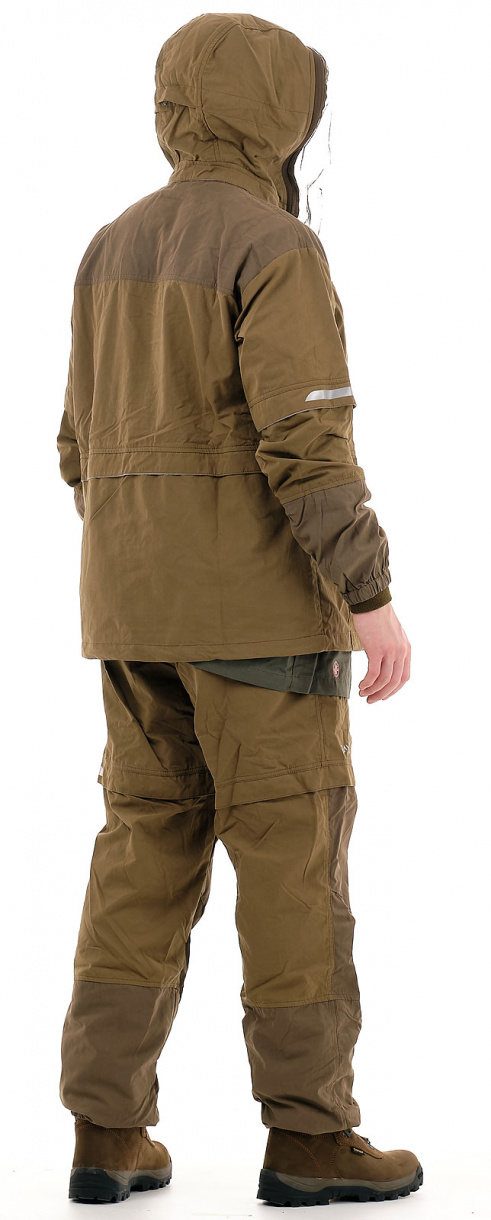 В отличие от других костюмов, обладает множеством защитных кулис и ловушек с вставками под пропитку акарицидными средствами. Сама ткань, из которой производится костюм, пропитана акарицидным средством и не теряет защитных свойств как минимум 10 стирок. Сетка накомарника съемная и легко убирается в потайной карман. Плотная однотонная ткань (70% хлопок, 30% нейлон) создает надежную защиту, позволяет телу «дышать» и повышает шансы своевременного обнаружения насекомых. Рукава оснащены плотными трикотажными манжетами. Область коленей усилена дополнительным слоем ткани. Этот костюм отлично подойдет для всех, кто много бывает в лесу.
