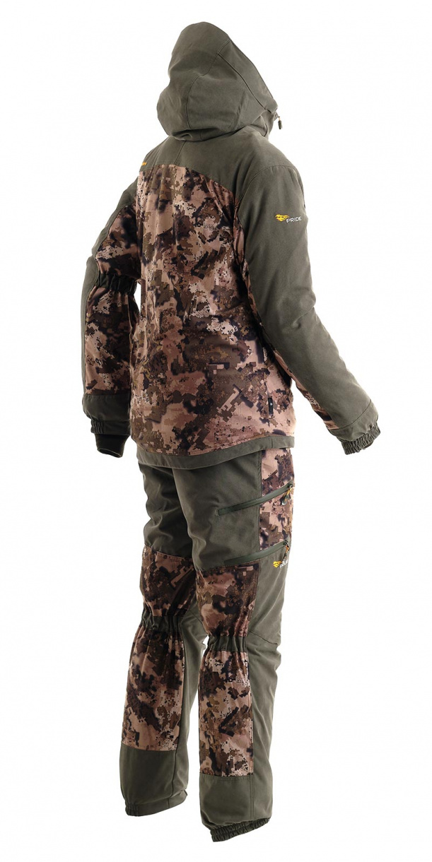 Костюм состоит из куртки и брюк. Куртка прямого кроя регулируется утяжками. Воротник-стойка переходит в утепленный капюшон, регулируемый по овалу лица и объему головы. Удобные наклонные карманы расположены на теле куртки и по бокам на брюках, все на молнии. Спинка брюк съемная, бретели регулируются.