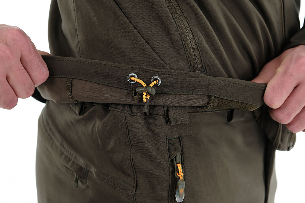 Низ куртки регулируется по ширине утяжкой на круглую резинку. Два прорезных кармана застегиваются на молнии с двумя бегунками и 5 карманов на брюках.