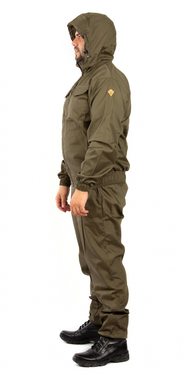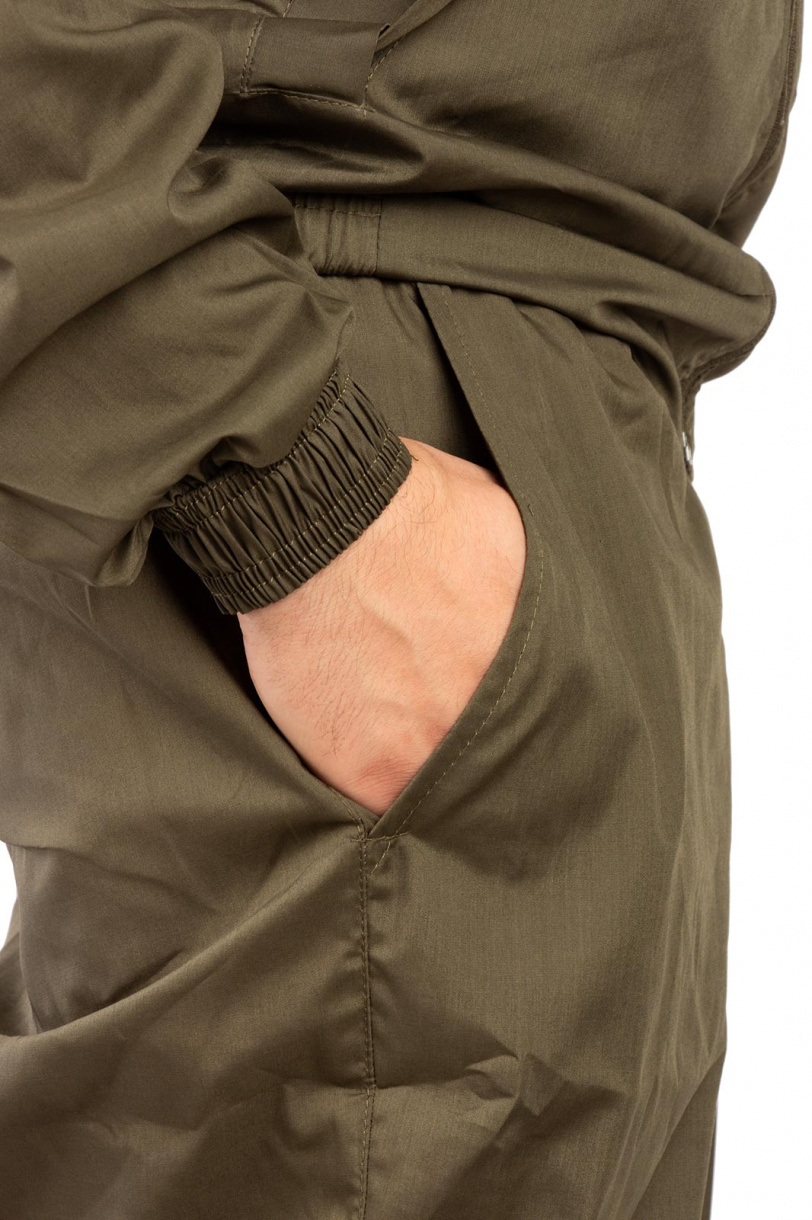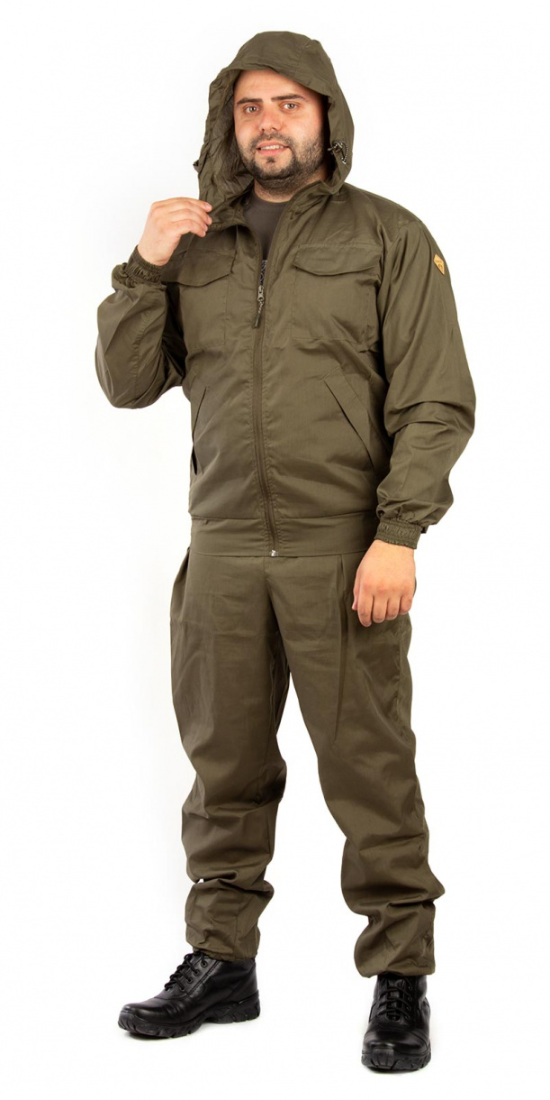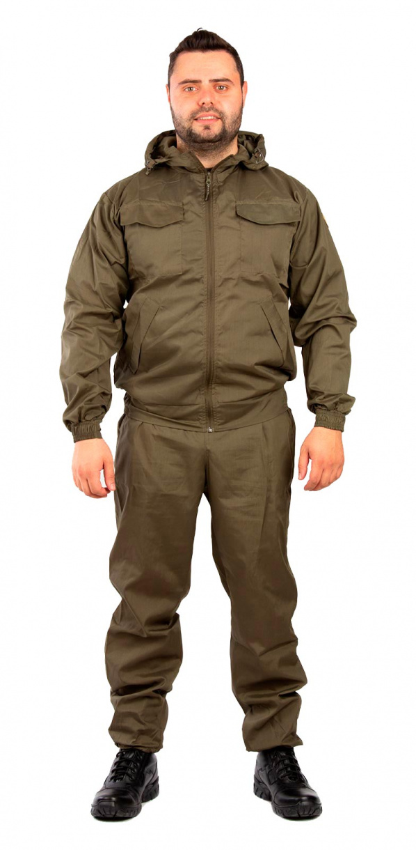 Низ укороченной куртки собран на широкую простроченную резинку. Капюшон регулируется по овалу лица. Два нагрудных кармана закрываются на клапаны с липучками, два нижних кармана с двойными листочками без застежки. Низ брюк и рукавов на резинке.