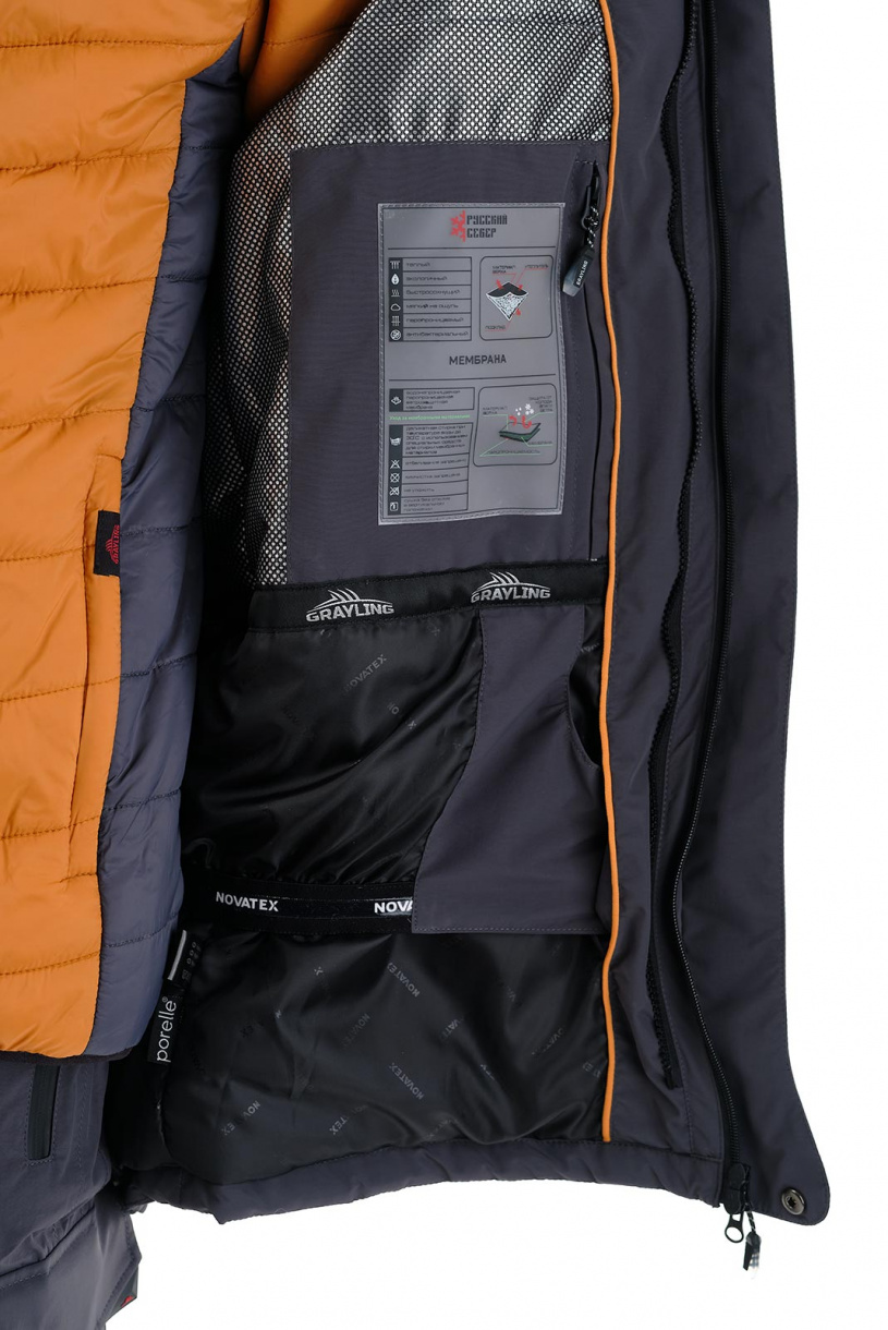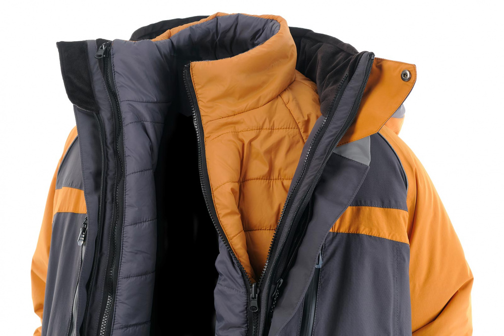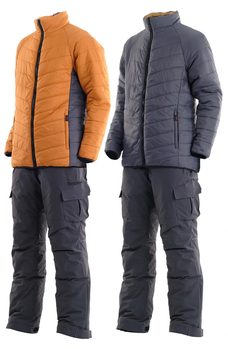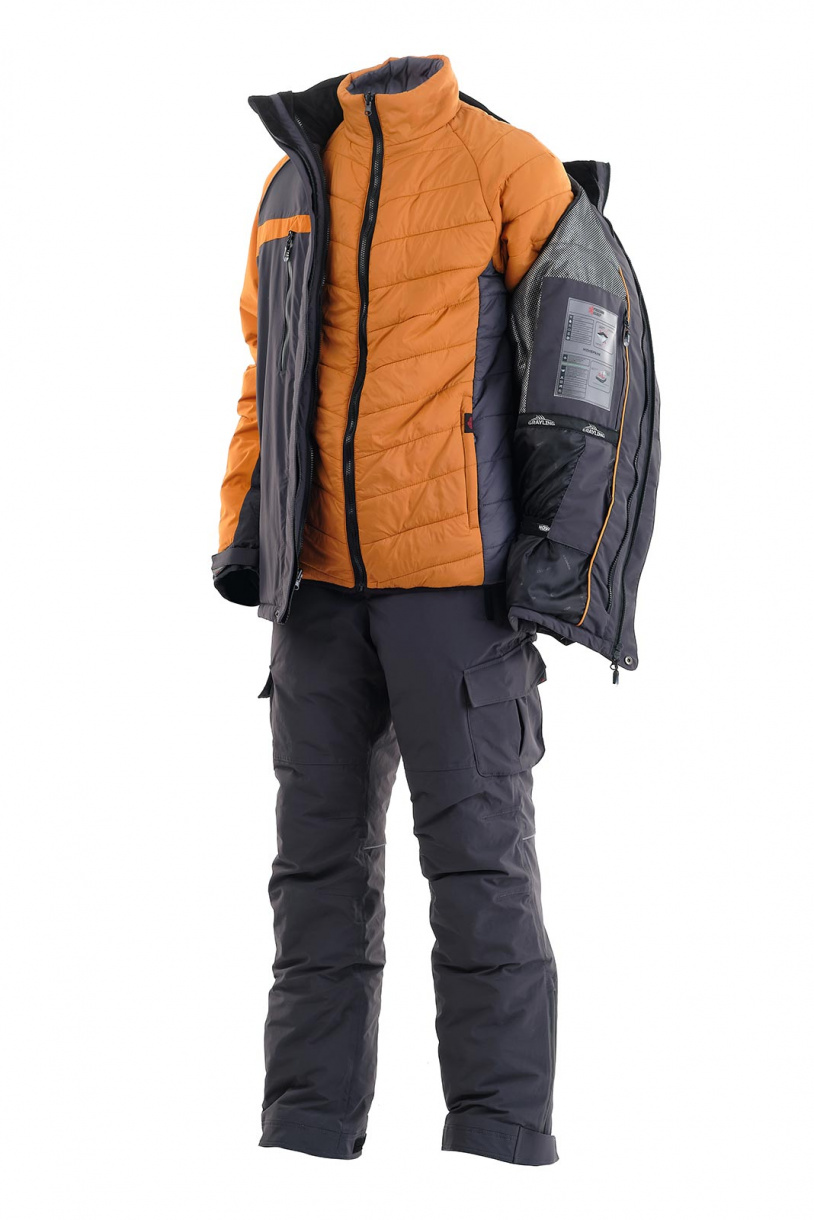 Зимний рыболовный костюм Riverside в цвете серый-горчица с дополнительной двухсторонней курткой-подстежкой, которая может использоваться как самостоятельное изделие.