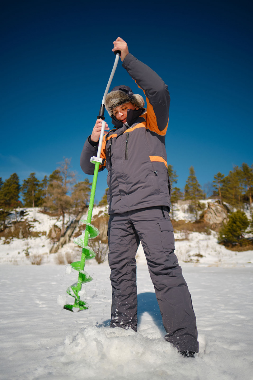 Очень практичный костюм для зимней рыбалки учитывает различные сценарии использования. Ехать к месту рыбалки в машине удобно в куртке-подстежке из нейлона. Она двухсторонняя, с одной стороны в цвете Горчица, с другой - Серая. Добираться пешком до нужной точки по льду можно в зависимости от климатических условий и личных предпочтений либо в подстежке в спокойную погоду, либо в основной куртке без подстежки, если ветрено. Рыбалка спокойная - куртка вместе с подстежкой. Рыбалка активная - куртка без подстежки. Разворачиваем палатку для рыбалки, включаем обогреватель в куртке с подстежкой, после прогрева снимаем основную куртку и ловим рыбку в подстежке.