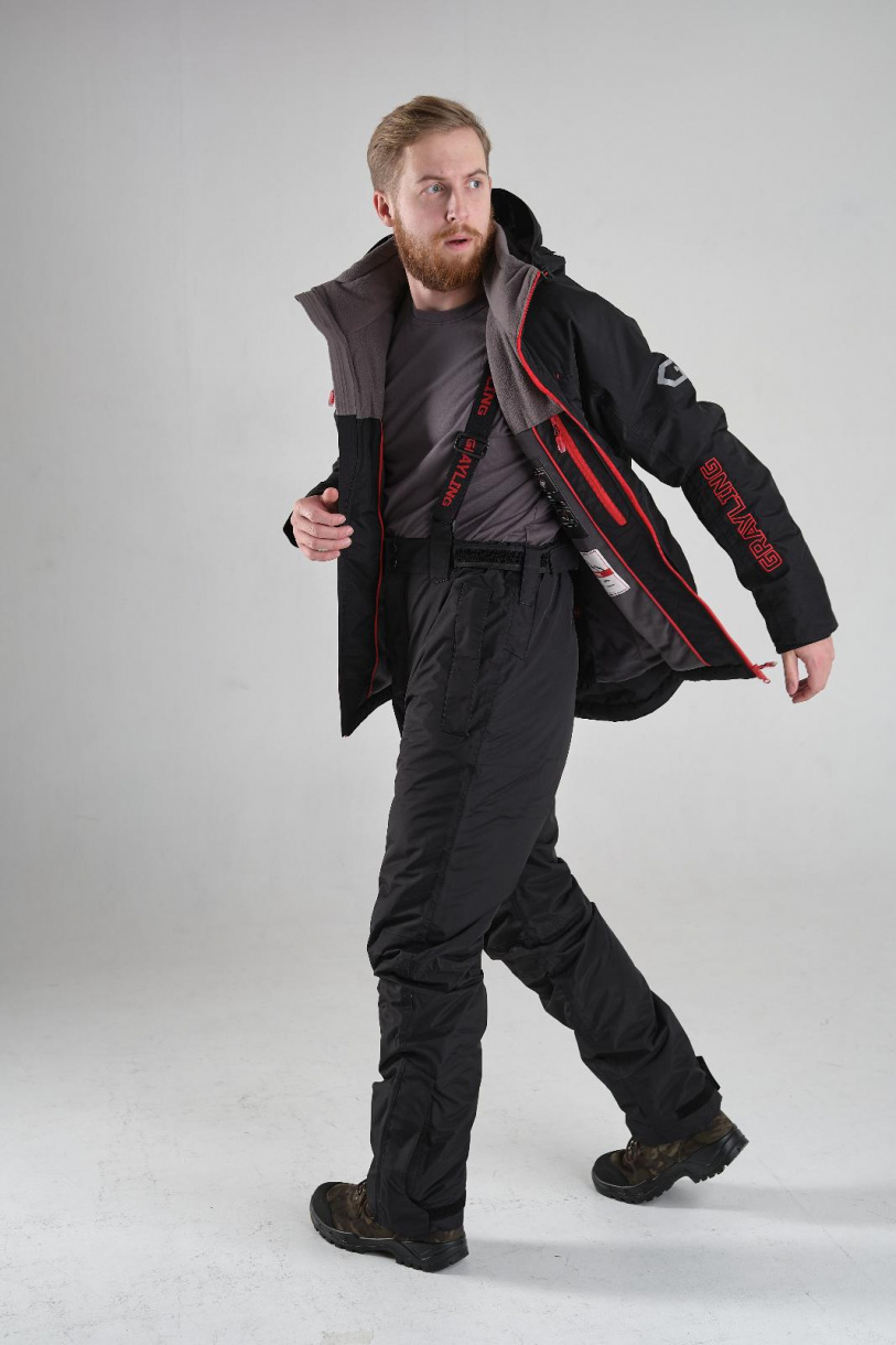 Костюм состоит из куртки и брюк. Куртка прямого кроя удлинена в районе спины. Низ куртки регулируется утяжками. Капюшон с козырьком отстегивается и также регулируется. На рукавах расположены липучки по внешней части и манжеты из неопрена (защита от ветра) внутри. Наружные карманы утеплены мехом вельбоа. У брюк отстегивается спинка, пояс регулируется вшитой резинкой и липучками. По низу брюк вшиты молнии и липучки также для регуляции объема. Карманы по костюму вместительные, есть внутренний для документов.