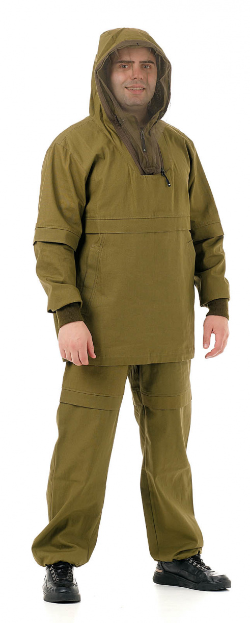 Костюм оснащен специальными ловушками для клещей – на рукавах, куртке, брюках. Сетка накомарника съемная и легко убирается в потайной карман на груди. Куртка утягивается по низу.