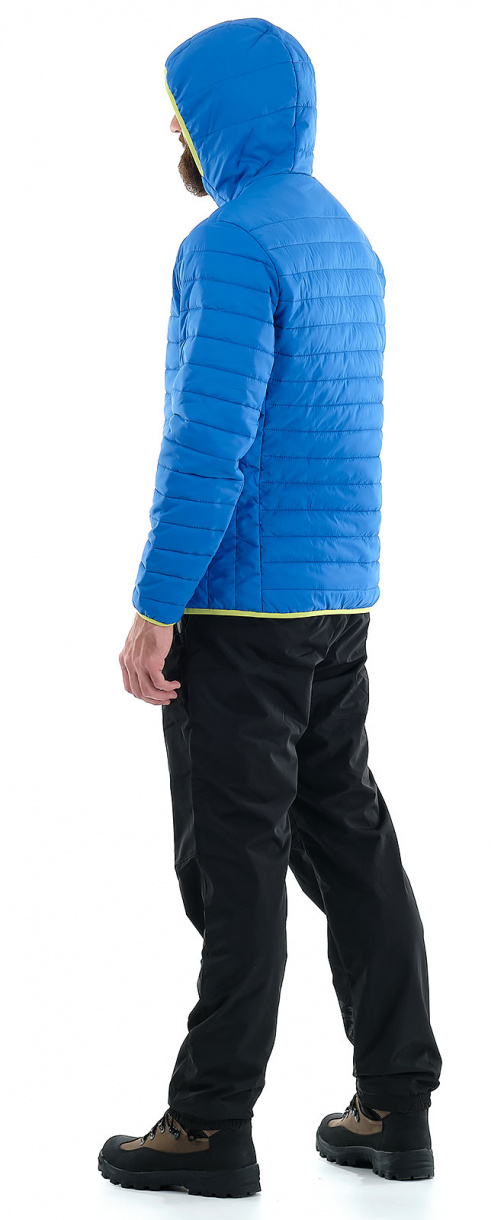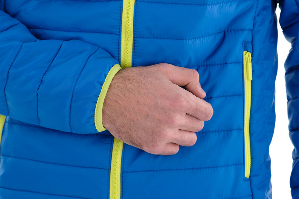 Куртка закрывается на центральную молнию с внутренней планкой для защиты от ветра.  Воротник -стойка, переходит в удобный капюшон, который великолепно защитит от непогоды и холода. Край капюшона окантован резинкой контрастного цвета.