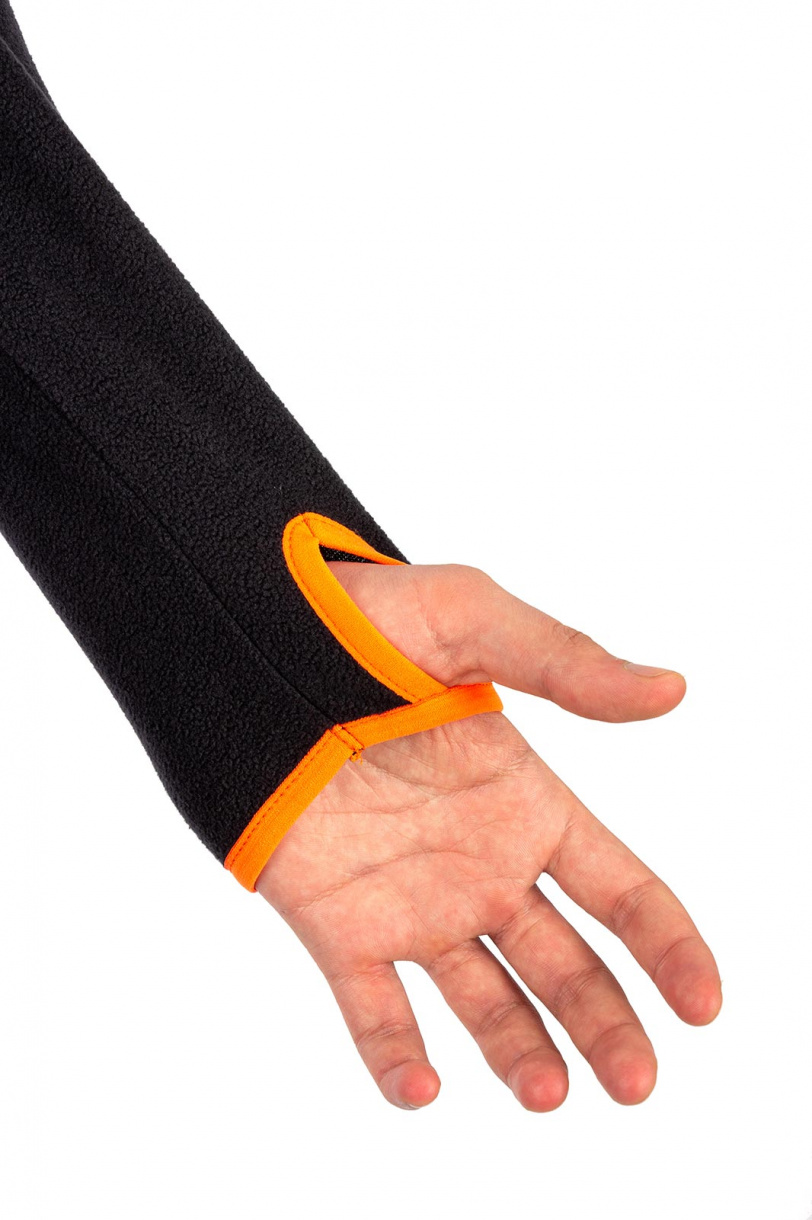• низ рукавов окантован резинкой контрастного цвета с петлей под большой палец для фиксации рукава при надевании верхней одежды